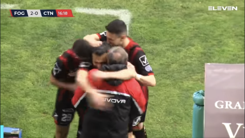 L’abbraccio tra Alessio Curcio e Zeman dopo la rete contro il Catania. Crediti Eleven Sports