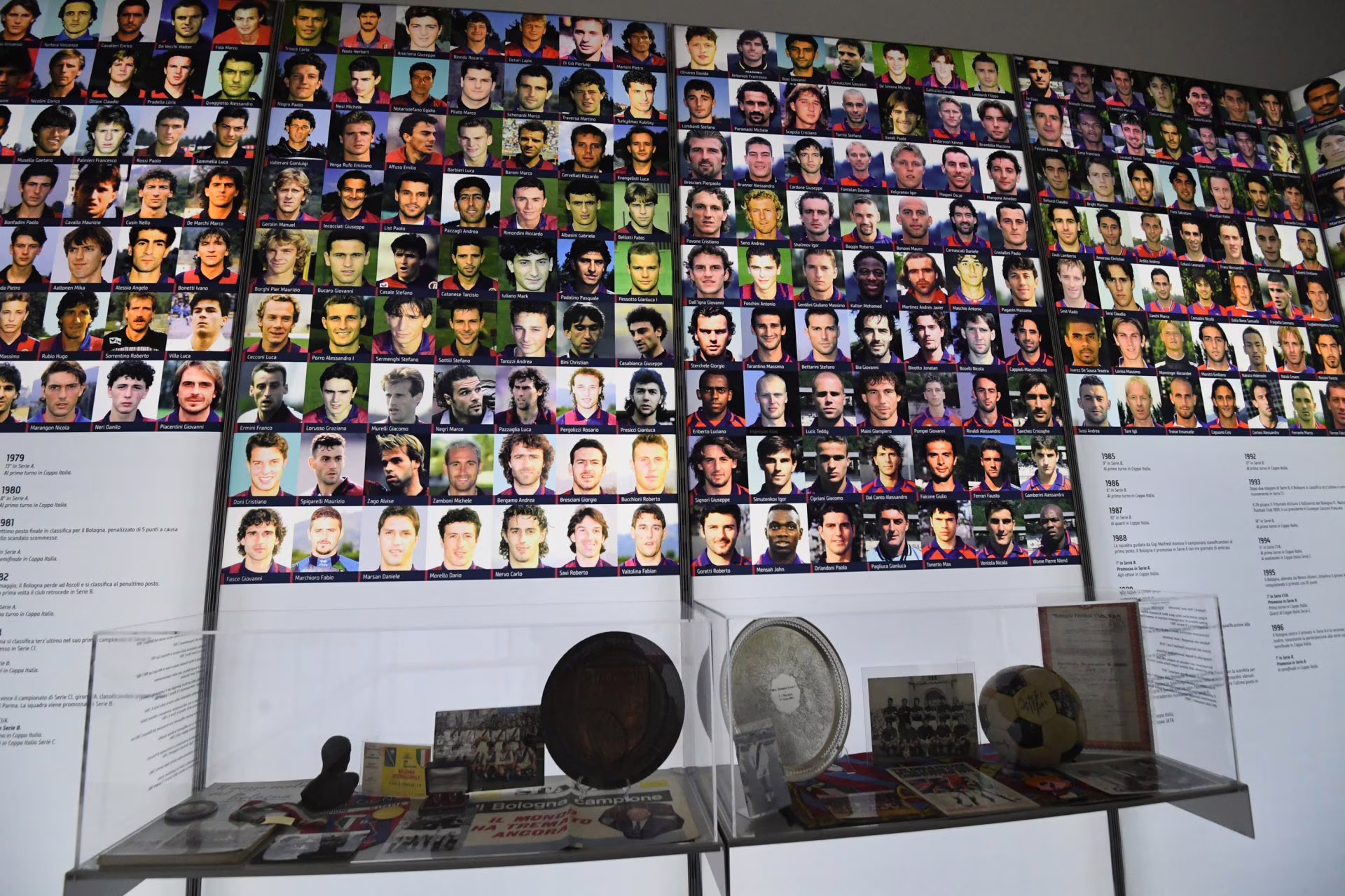 Nella prima sala sono raccolte le foto degli oltre 900 giocatori che hanno vestito la maglia rossoblù come Antonio Bernabeu, fratello del Santiago del Real Madrid, da cui l’idea di disputare una partita tra le leggende emiliane e quelle spagnole.