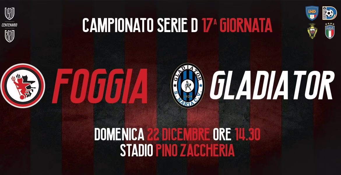 Il Calcio Foggia 1920 rende noto che è aperta la vendita dei tagliandi per assistere all’incontro di calcio Foggia-Gladiator, valido per la 17^ giornata del campionato di Serie D girone H, in programma domenica 22 dicembre (ore 14:30) al Pino Zaccheria.