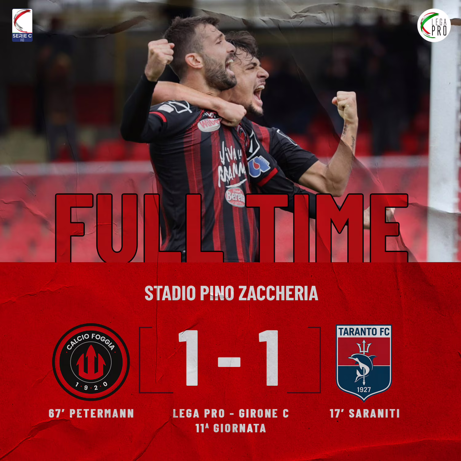 Serie C – girone C undicesima giornata, il Foggia riacciuffa il Taranto tra le mura amiche del “Pino Zaccheria” nel Derby: 1-1 il risultato finale.