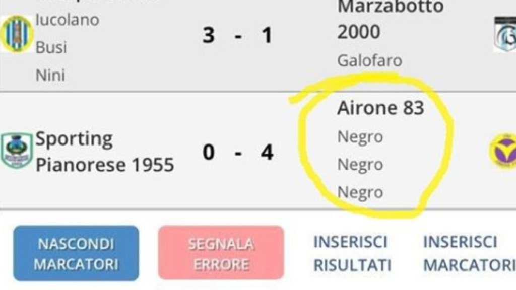 Subito dopo la partita di categoria Juniores Emilia-Romagna tra Sporting Pianorese e Airone Calcio, conclusasi sullo 0-4 per gli ospiti, qualche utente di Tuttocampo.it ha denominato “negro” l’attaccante di colore dell’Airone, autore di una tripletta.