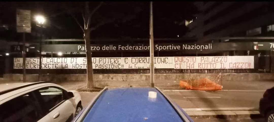 “In questo calcio di solo potere e corruzione… Non fermerete la nostra passione!!! Questo palazzo ci ha rotto il c***o!“, scrive La Foggia Ultras, in uno striscione affisso sotto la sede del CONI a Roma.