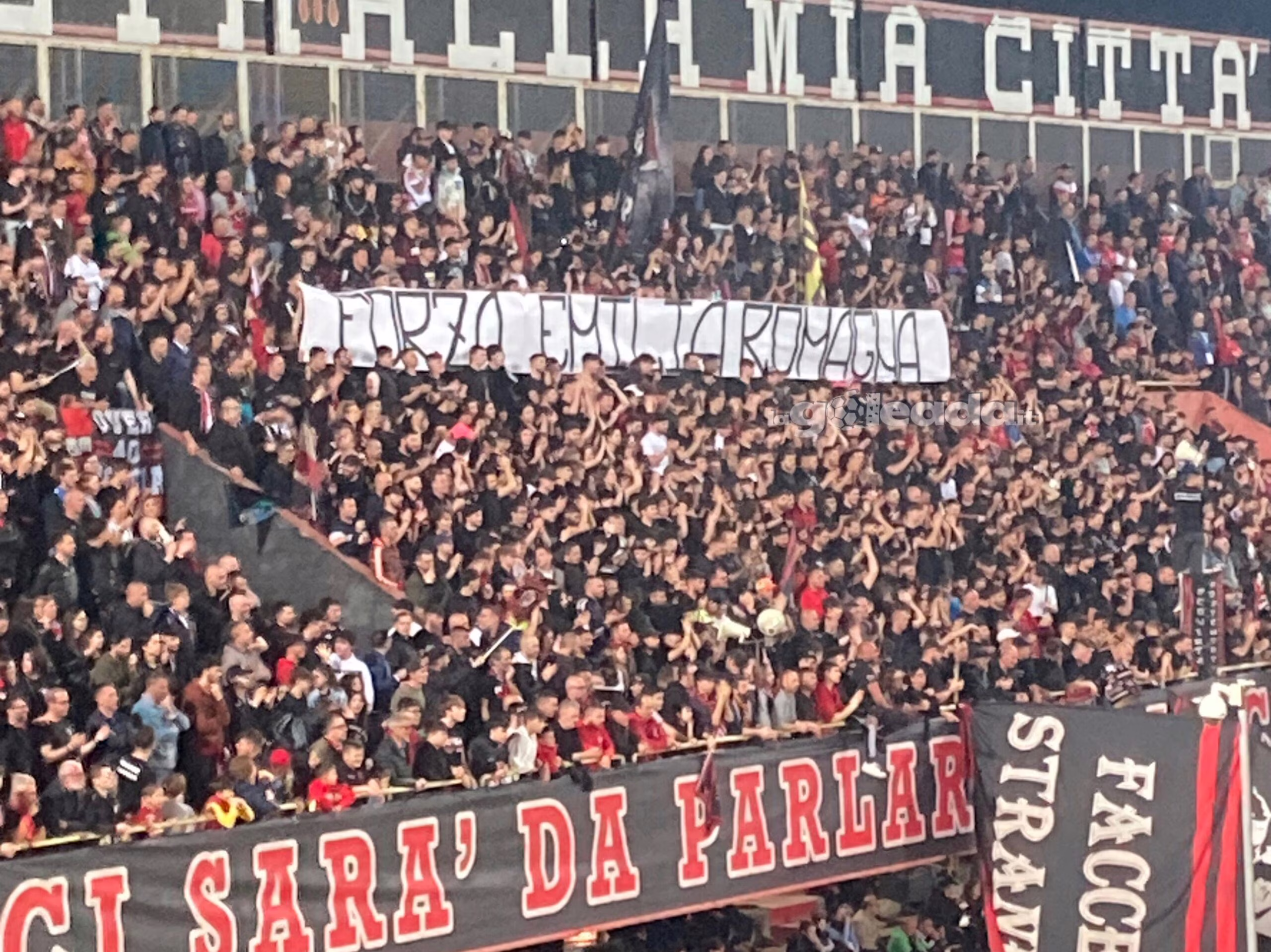 Poche semplici ma sentite parole di supporto e incoraggiamento ai cittadini: “Forza Emilia-Romagna“, recita lo striscione mostrato sugli spalti.