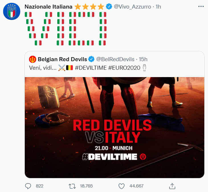 Sul proprio profilo ufficiale Twitter, la Nazionale belga aveva pubblicato una locandina in vista del match con l’Italia, con la didascalia:
