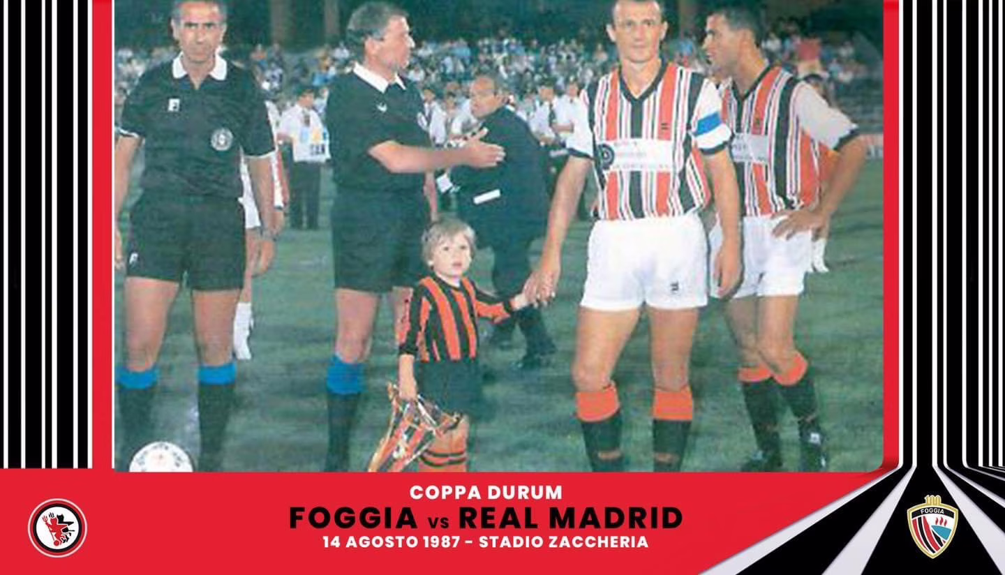 La partita in questione era Foggia-Real Madrid del 14 Agosto 1987 in occasione della Coppa Durum, il torneo amichevole organizzato dall’allora patron del Foggia, Pasquale Casillo. Il quadrangolare prevede la partecipazione anche della Sampdoria e del Porto. L’evento venne trasmesso in diretta dalla RAI.
