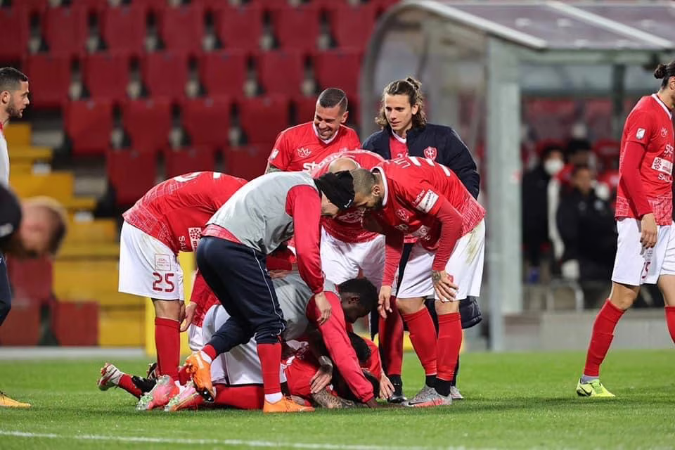 L’abbraccio della squadra a Vincenzo Sarno dopo il gol, crediti: U.S Triestina Calcio 1918